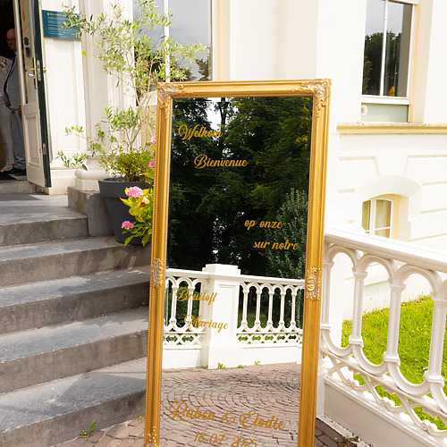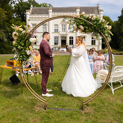 Toen de trouwdag eindelijk aanbrak, straalde alles precies zoals ze hadden gehoopt. De zon scheen volop en het landgoed vormde een prachtig decor voor hun ceremonie. “Het was prachtig weer. 27 graden, zon, lichte bewolking. De wolken zorgden zelfs voor een beetje verkoeling,” vertelt Elodie. Met hun dierbaren om zich heen gaven ze elkaar het ja-woord in een setting die intiem en warm aanvoelde.