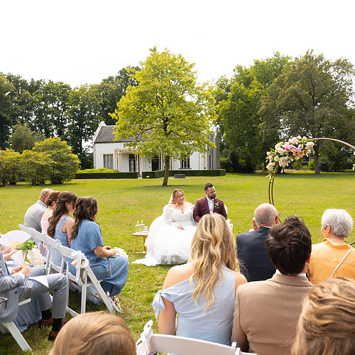 Tijdens de fotoshoot hebben we ook onze geloften naar elkaar uitgesproken. We vonden het fijner om dit samen te doen in plaats van voor een grote groep tijdens de ceremonie. Onze gasten arriveerden ondertussen en toen was het tijd voor de ceremonie op het Zuiderveld naast het kasteel. Dat was zo’n bijzonder moment. Met een klein clubje mensen bij elkaar en het was heel persoonlijk.’’