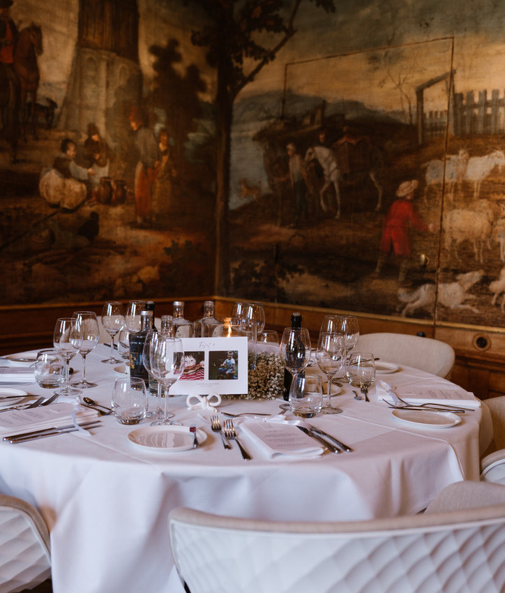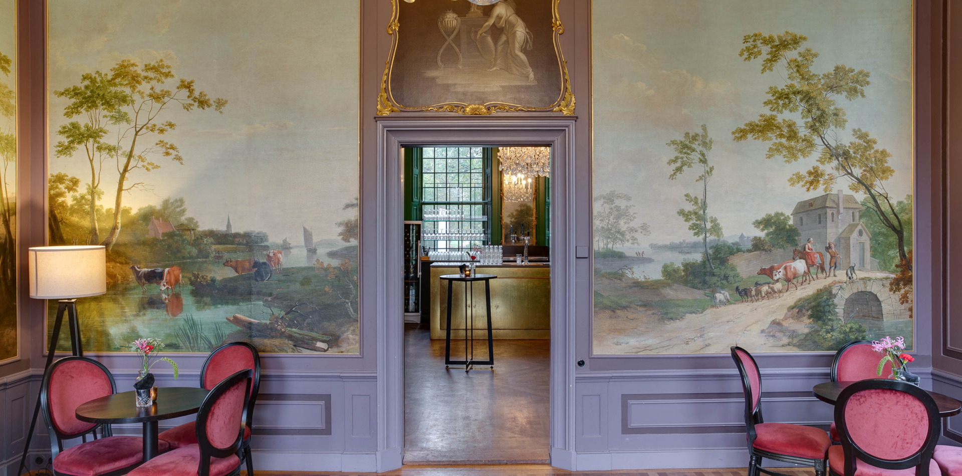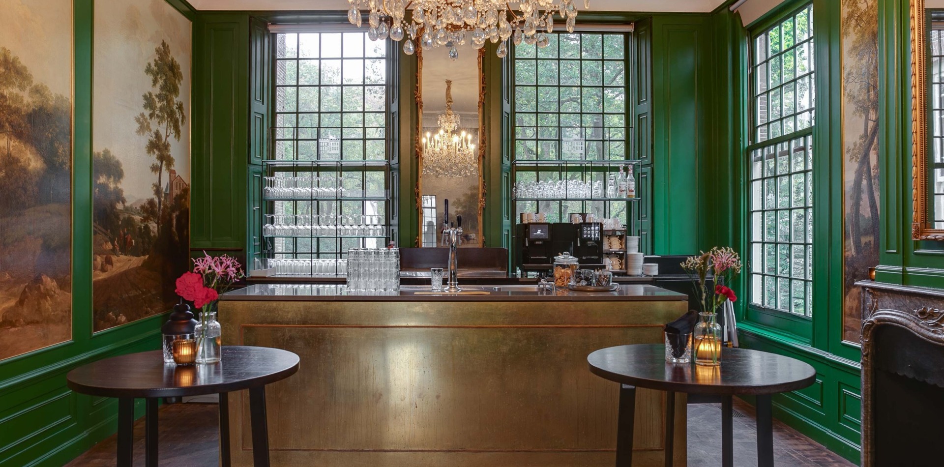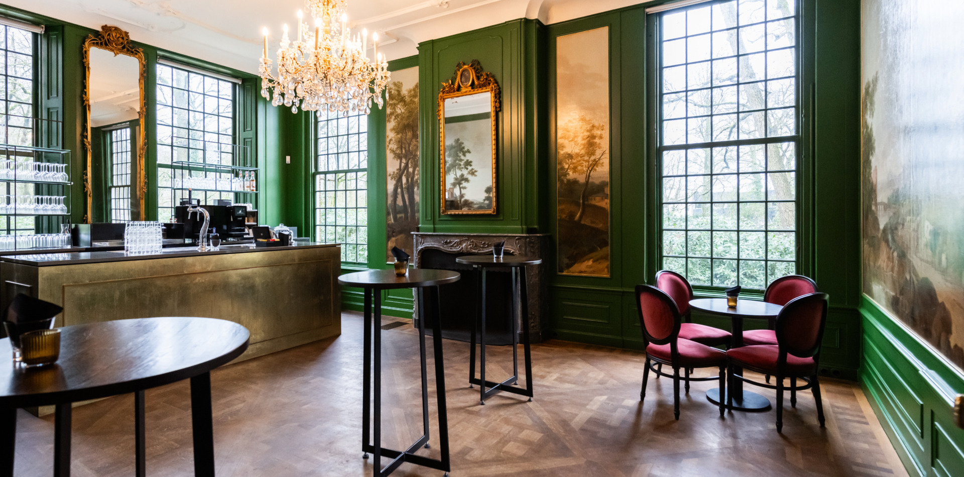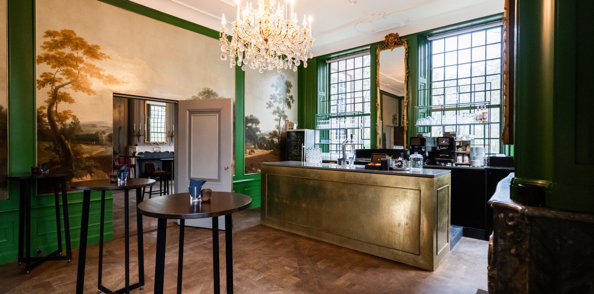 Op de bel-etage vindt u, net als de Lounge en de Grote Salon, de Bar. Alle ruimtes op de bel-etage samen vormen een prachtig decor voor een informeel diner of feest met circa 120 personen.