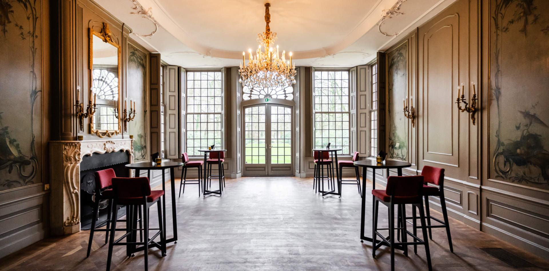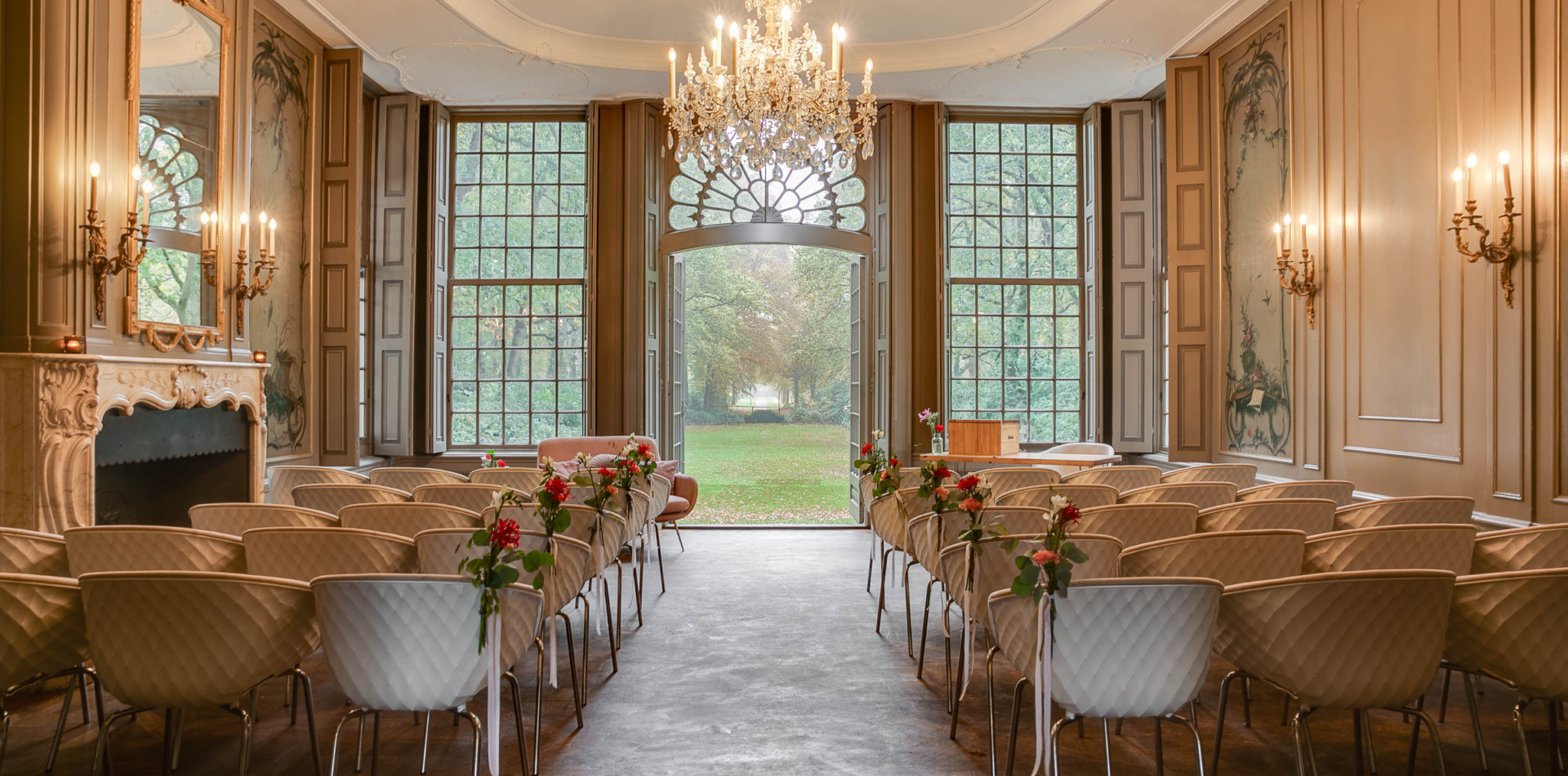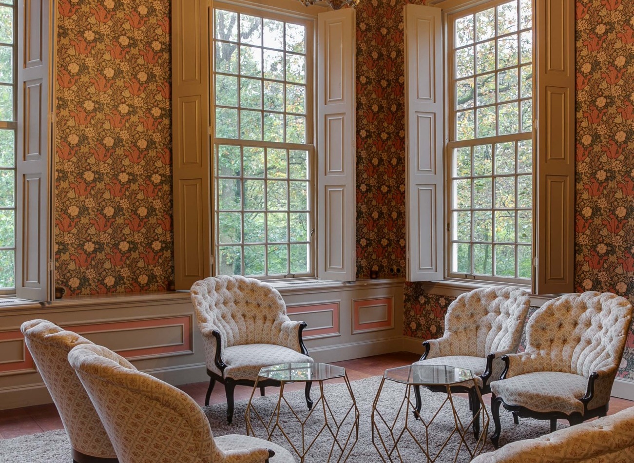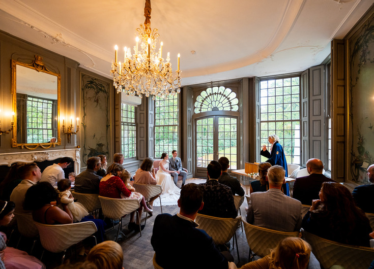 Op de bel-etage vindt u de Grote Salon, een perfecte ruimte voor huwelijksvoltrekkingen met circa 50 gasten. Daarnaast heeft deze ruimte een prachtig uitzicht over de parktuin.