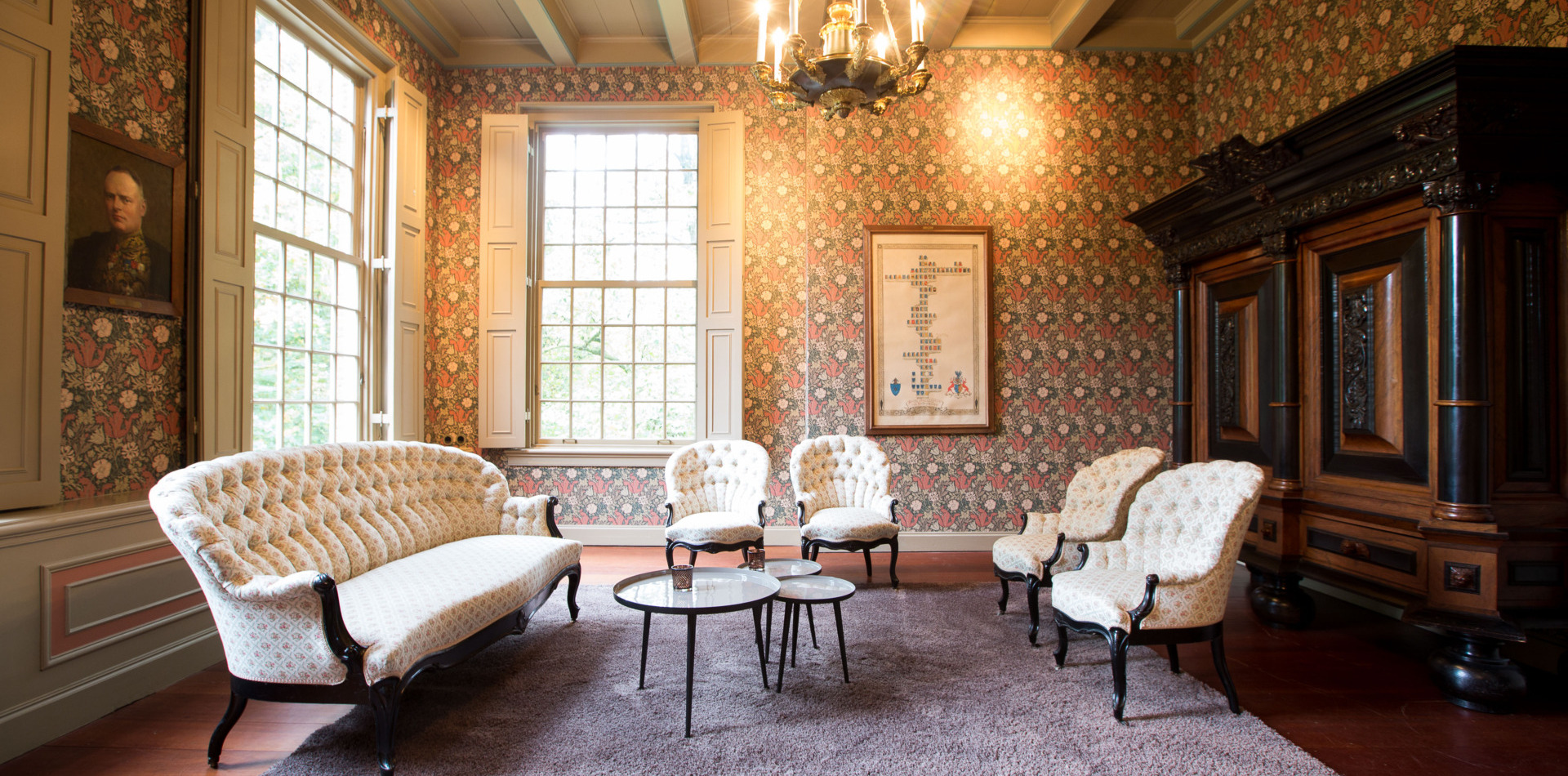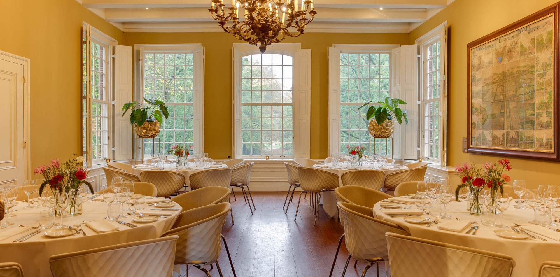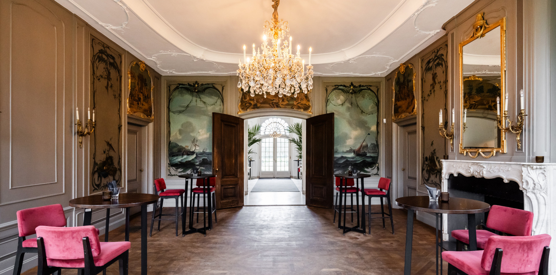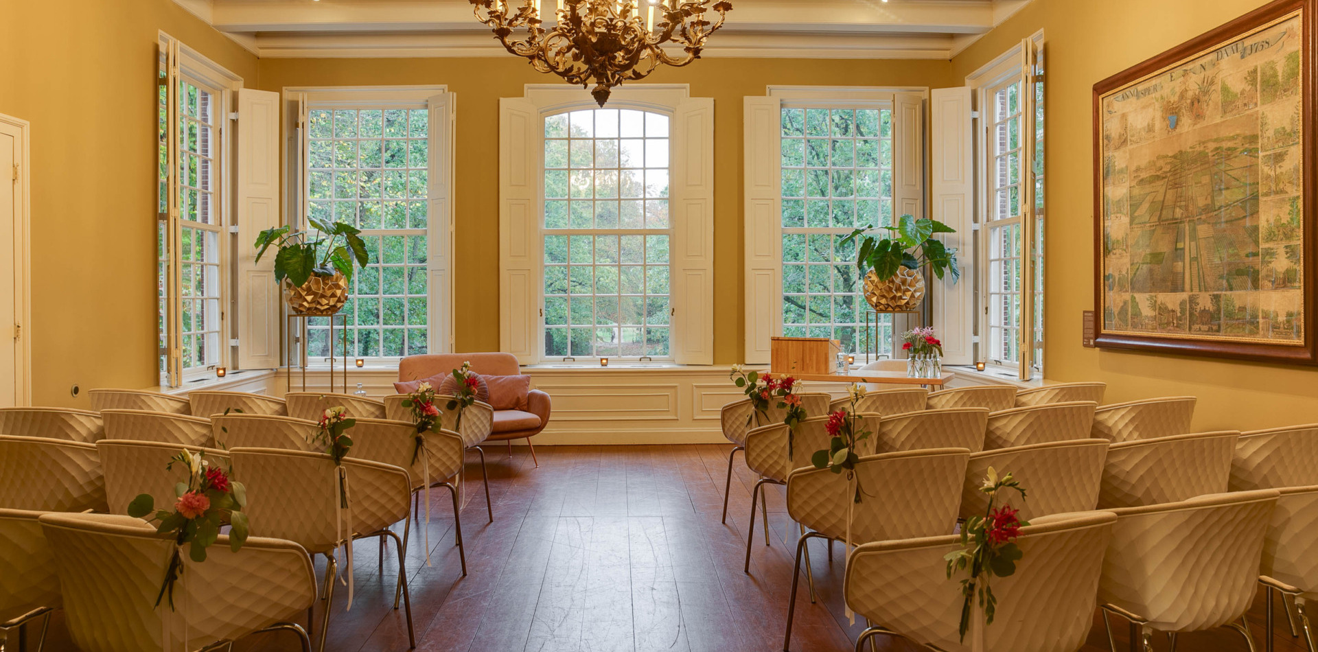 Op de bel-etage vindt u de Grote Salon, een perfecte ruimte voor huwelijksvoltrekkingen met circa 50 gasten. Daarnaast heeft deze ruimte een prachtig uitzicht over de parktuin.