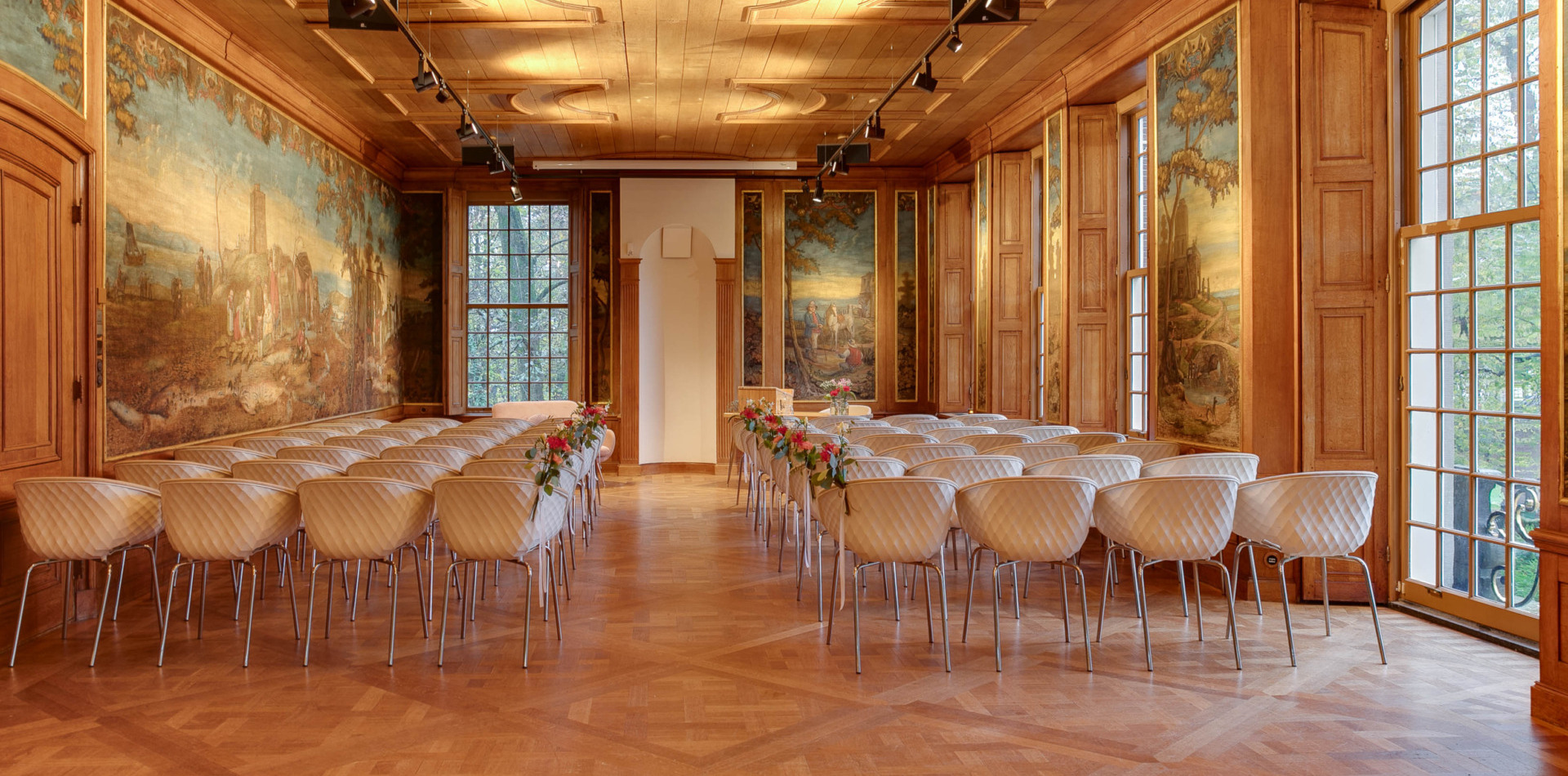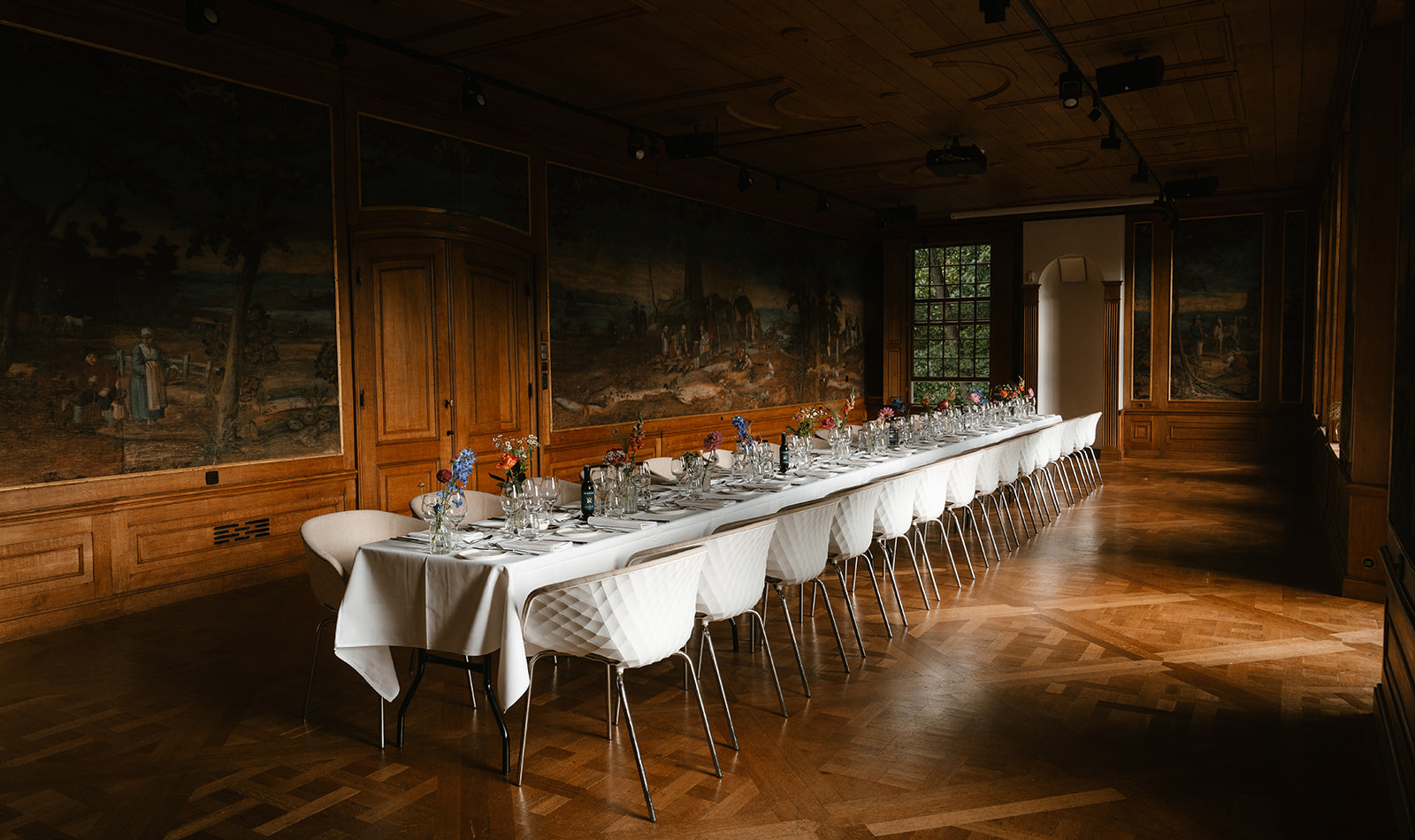 De Raadzaal is de grootste ruimte van het landhuis en kan worden gebruikt voor huwelijksvoltrekkingen, feesten of diners met 100 gasten. In de Raadzaal beschikken jullie over een uitstekende geluidsinstallatie met microfoon, een vaste beamer voor perfect kleurrijk en krachtig beeld met een breedbeeldprojectiescherm en een katheder voor speeches.